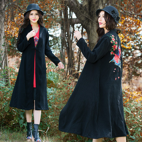 實拍新款秋冬女大碼民族風繡花風衣長款開衫外套外披 /