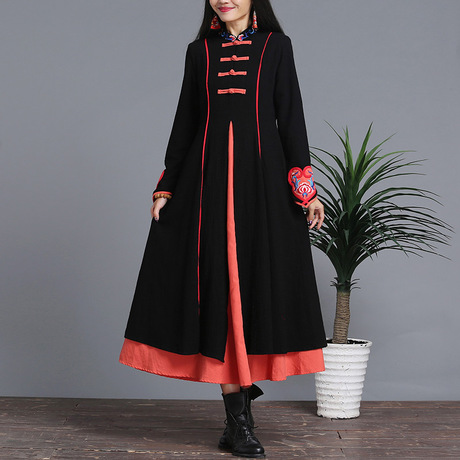 實拍民族風女裝秋冬新款如意刺繡立領顯瘦連衣裙 /
