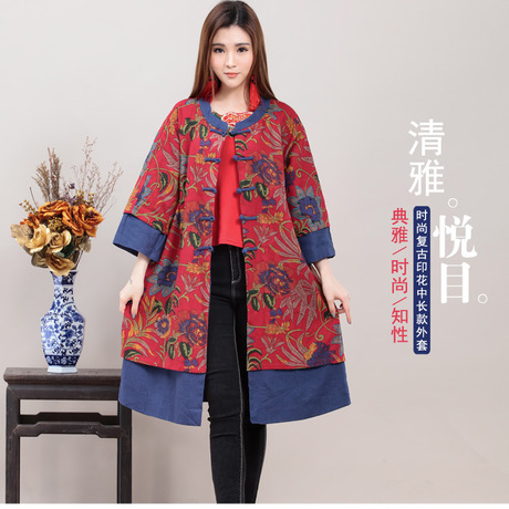實拍民族風秋裝 印花寬松大碼胖MM棉麻盤扣 中袖風衣外套女 /