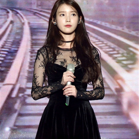 秋季步步驚心麗IU同款絲絨蕾絲拼接修身A字擺連衣裙禮服裙 /