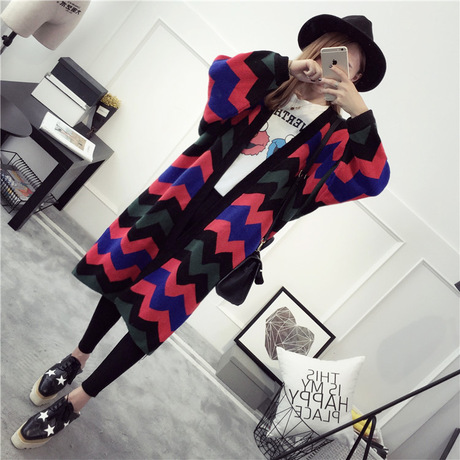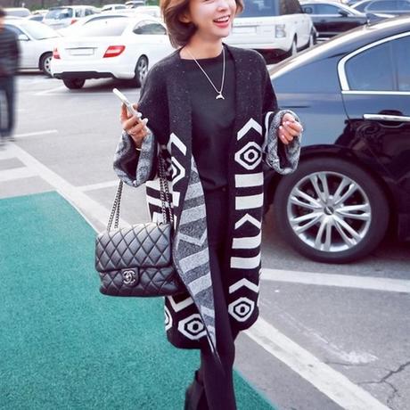 秋冬新款韓版中長款幾何圖案寬松針織衫開衫外套毛衣女 /