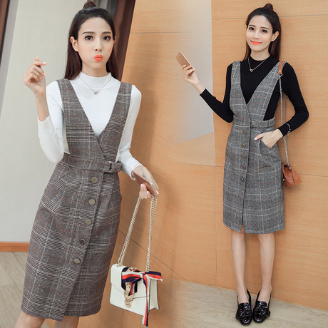 秋裝新款高領針織衫+格子背帶連衣裙兩件套裝 女 /